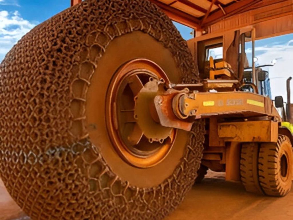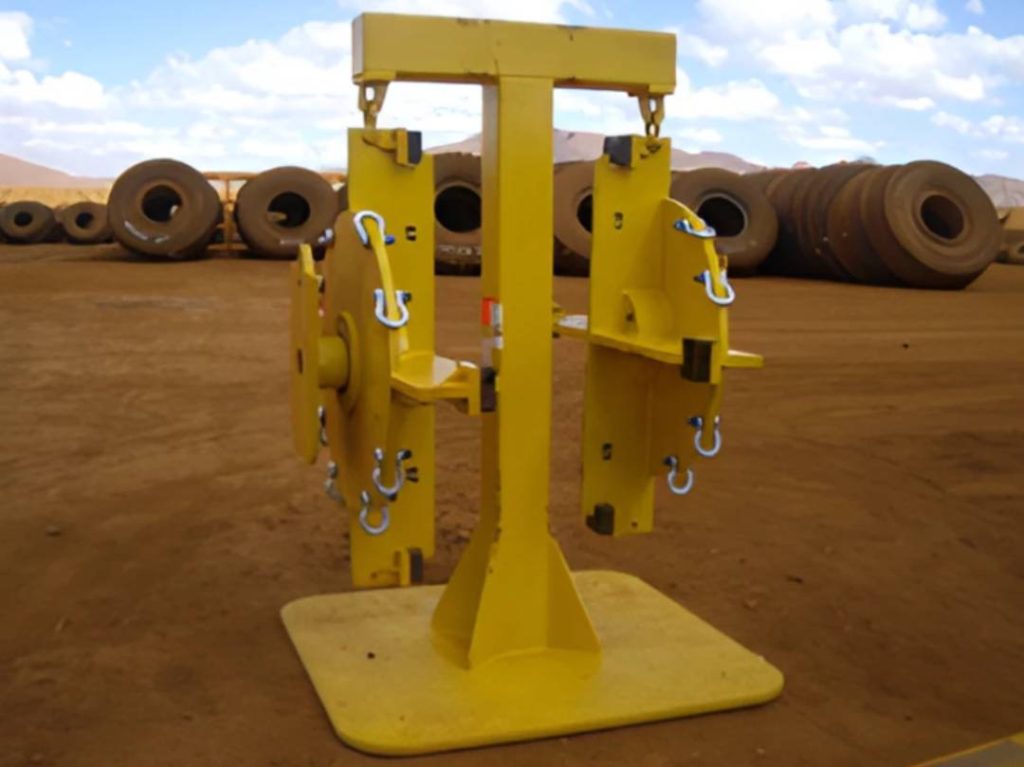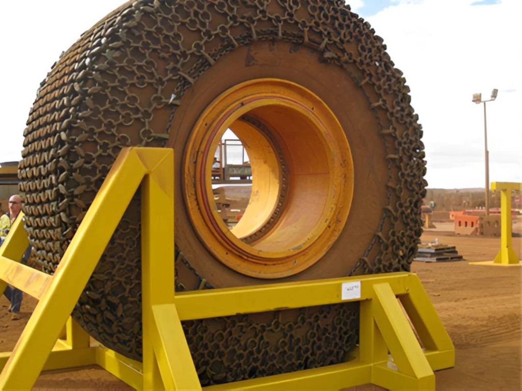 This system enables tyre chains to be installed off the machine, eliminating the need for the operator to be within the direct working area of the loader or haul truck. The chains are fitted safely, quickly, and efficiently using a Tyre Handler and a specially designed spindle that secures the chains to the wheel assembly.